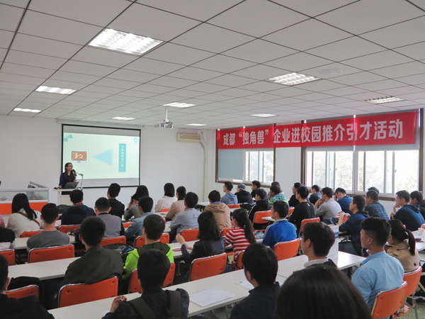 【本网讯】为深入实施人才优先战略,贯彻落实“成都人才新政12条”,促进新经济企业发展,提高新经济企业对各类人才的本地获得率,由市人社局、市人才办、市新经济委、市科技局、市教育局、团市委主办,乐动和市人才市场承办的成都“独角兽”企业进校园推介引才活动于4月16日在航空港校区信息楼310成功举办。
