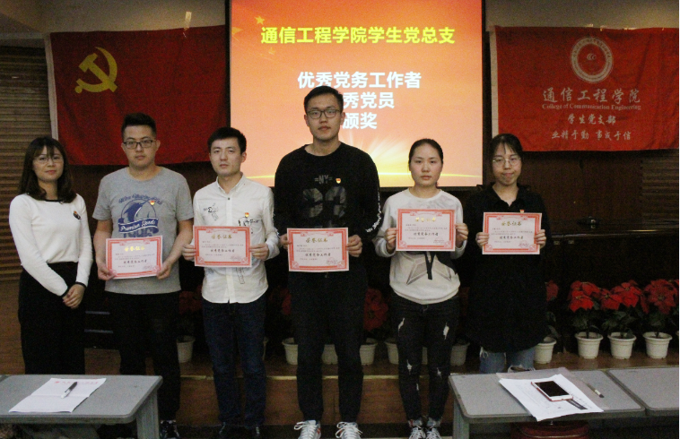 王燕老师代表党支部对获奖人员表示祝贺,并对在支部辛勤工作的各位同志们表示以节日的问候和衷心的感谢。她指出,在学院党总支的正确领导下,学生党支部工作围绕中心抓党建,服务大局,积极创新,尤其在学习十九大精神和两会精神中,全体党员积极践行社会主义核心价值观,丰富学院“业精于勤,事成于信”特色文化以及课外科技活动中做了大量工作,效果突出,充分发挥基层党支部的堡垒作用和党员先锋模范带头作用。作为学生党员应该牢记”责任、团结、力争“的通信学生党支部精神,努力打造一支作风优良的党员队伍,并希望学生党支部上下进一步弘扬改革创新的精神,不断总结经验,开拓出学生党建工作的新局面。