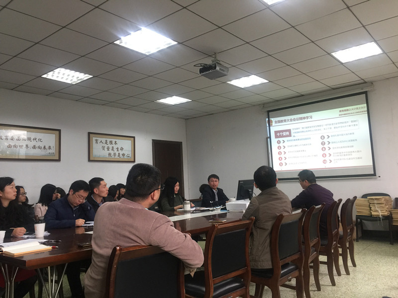 学院副院长杨定宇带领全院教职工从会议背景、会议精神、习近平心中的“好老师”、习近平谈教育发展的重要论述等四方面进行深入学习。他简单介绍了全国教育工作大会的会议背景,重点解读了习近平总书记所强调的围绕“一个目标”,做到“九个坚持”,明确“一个根本任务”,从“六个方面下功夫”,做好社会主义建设者和接班人的培养工作。杨定宇指出,全体教职工要严格按照习近平总书记提出的“三个牢固树立、四个有”的“好老师”标准,牢固树立中国特色社会主义理想信念,牢固树立终身学习理念,牢固树立改革创新意识,做一名有理想信念、有道德情操、有扎实知识、有仁爱之心的好老师。