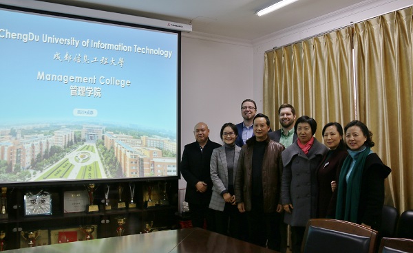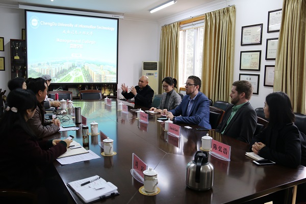 【本网讯】12月4日下午,美国西肯塔基大学中国项目部负责人David Kerr,美国明尼苏达大学 T. Ryan Hall博士,ESLI成都教学中心代表,四川宏图出国留学服务公司总经理宋泰村等一行五人到访乐动管理学院,洽谈国际合作交流项目。管理学院党总支书记王子华,副院长李贵卿、孙艳玲,实证研究中心主任龚季兴等参加了交流座谈。