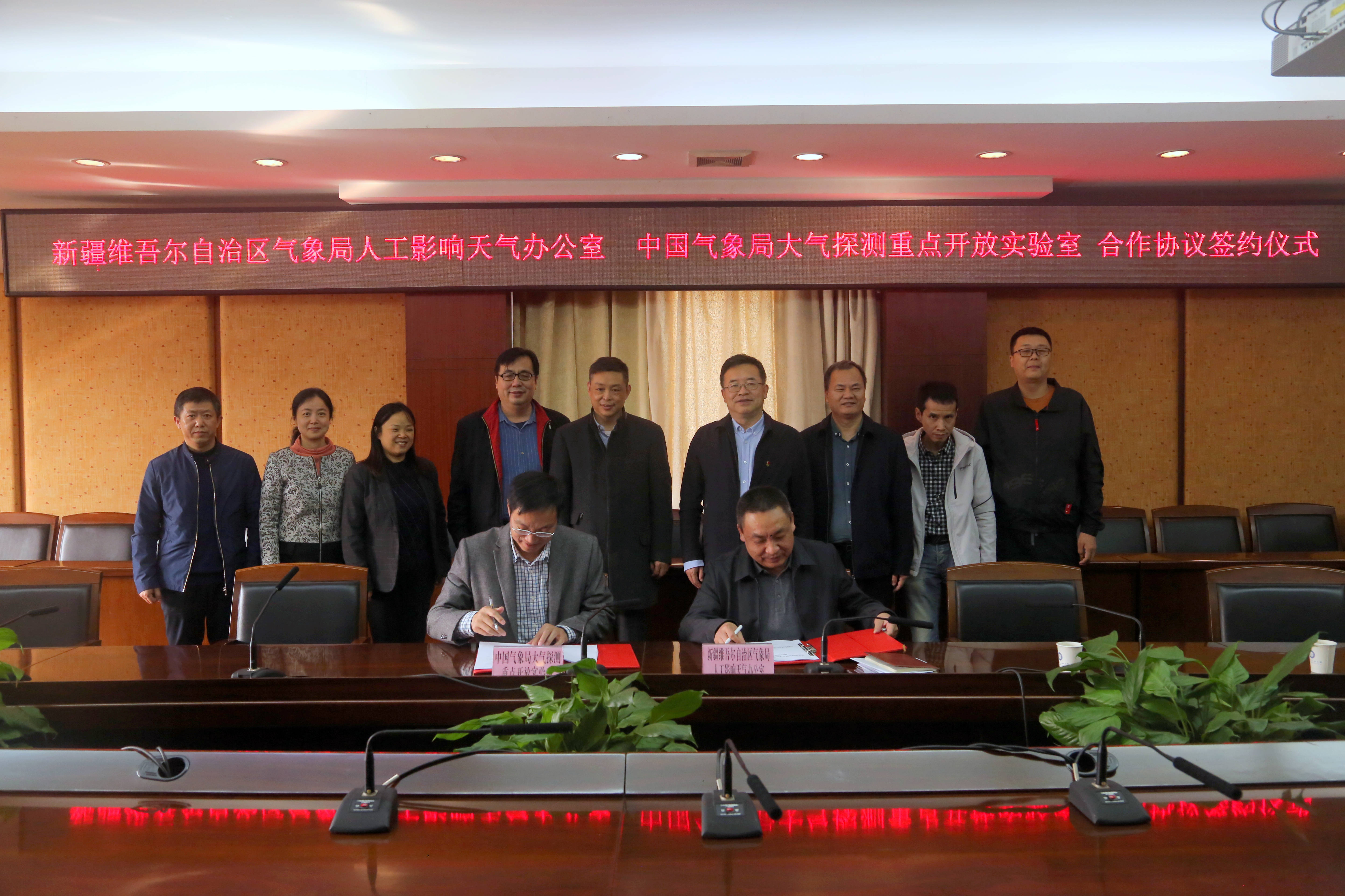 【本网讯】11月20日下午,新疆维吾尔自治区人工影响天气办公室与学校中国气象局大气探测重点开放实验室合作协议签约仪式在行政楼七会议室举行。自治区气象局副局长何清、人工影响天气办公室主任陈胜、乐动副校长范广洲参加签字仪式,会议由重点开放实验室常务副主任苏德斌教授主持。