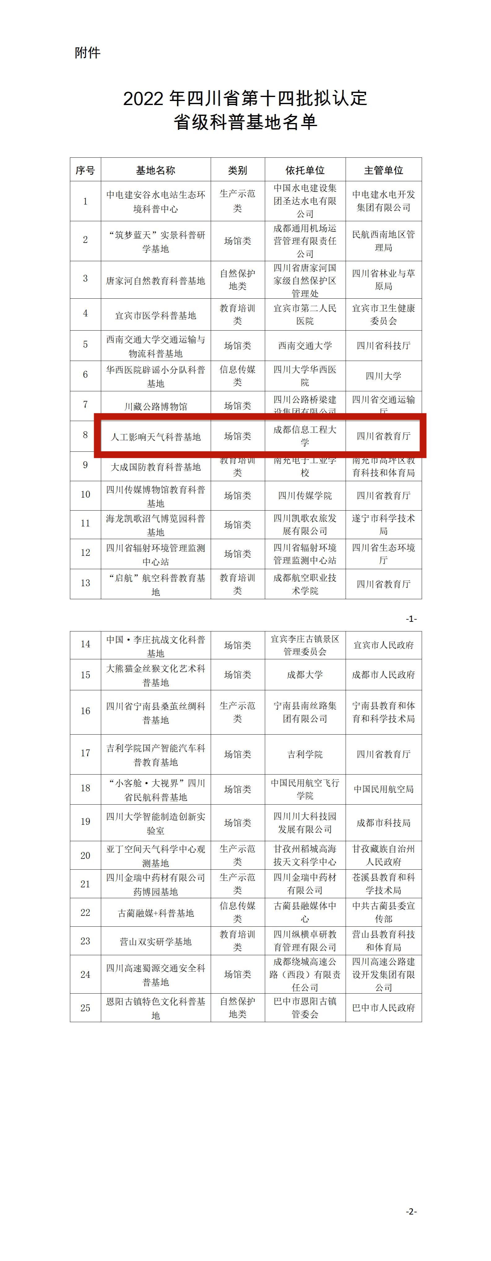 【本网讯】近日,四川省科学技术厅、四川省委宣传部和四川省科学技术协会组织开展了2022年四川省第十四批省级科普基地的认定工作。依托“中国气象局-人工影响天气联合研究中心(以下简称人影研究中心)”等相关平台申报的“人工影响天气科普教育基地”获批四川省科普基地,乐动在气象科技领域又新增一省级科普平台,将有力扩大乐动在气象防灾减灾等方面的科普影响力。