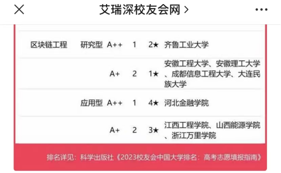 【本网讯】近日,全国第三方大学评价机构艾瑞深校友会网撰写完成、科学出版社即将出版发行的《2023校友会中国大学排名:高考志愿填报指南》中,最新发布了校友会2023中国大学区块链工程专业排名,乐动区块链工程专业排名全国第二,评为A+级。