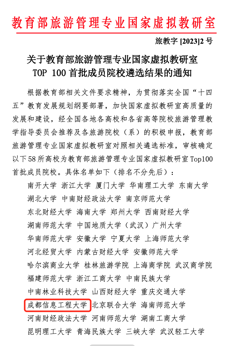 【本网讯】根据《教育部关于加快建设高水平本科教育 全面提高人才培养能力的意见》和《教育部关于深化本科教育教学改革 全面提高人才培养质量的意见》等文件精神,为贯彻落实全国“十四五”教育发展规划纲要部署,加快国家虚拟教研室高质量的发展和建设,经全国各旅游院校(系)积极申报、各地各高校和各省高等院校旅游管理教学指导委员会推荐,教育部旅游管理专业国家虚拟教研室对照相关遴选标准,审核确定了首批58所高校为教育部旅游管理专业国家虚拟教研室Top100首批成员院校。乐动以管理学院院长宋雪茜教授为组长,专业带头人黄萍教授、旅游与市场系主任钱永贵副教授、旅游管理硕士(MTA)教育中心主任马佳副教授为骨干成员组成的团队,成功入选。