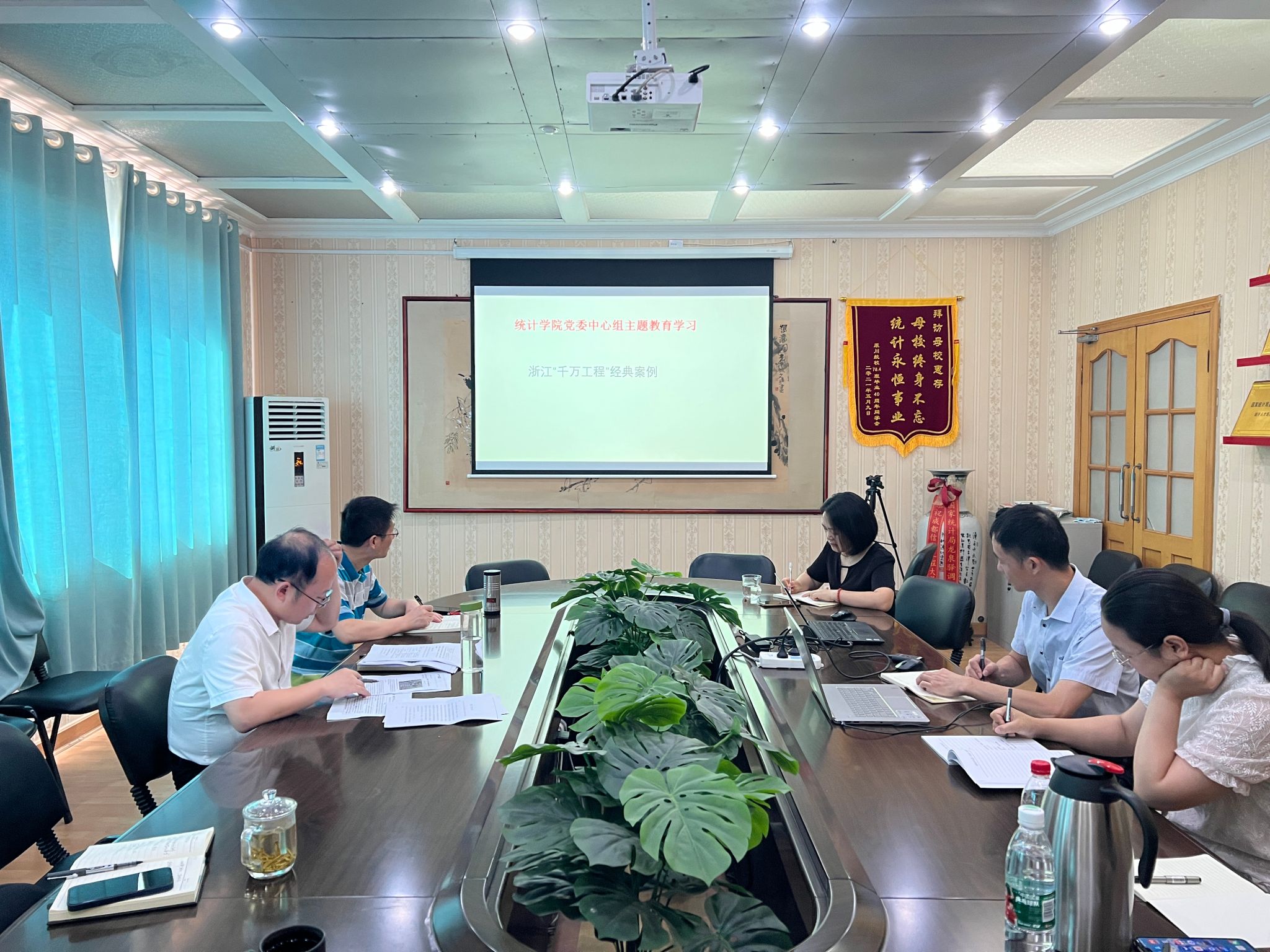 金明带领与会人员集体学习了“造就万千美丽乡村 造福万千农民群众——浙江20年持之以恒实施‘千万工程’经验案例”。金明谈到,“千万工程”是习近平总书记在浙江工作时亲自谋划、亲自部署、亲自推动的一项重要决策;20年来,从“千村示范、万村整治”到“千村精品、万村美丽”再到“千村未来、万村共富”,造就了万千美丽乡村,造福了万千农民群众,为浙江高质量发展建设共同富裕示范区打下扎实基础,要深刻认识“千万工程”的重要意义,进一步感悟习近平新时代中国特色社会主义思想的真理力量。“千万工程”是学习和理解习近平新时代中国特色社会主义思想的生动实践,是“两个确立”决定性意义的有力例证,是开展主题教育的生动教材。他强调,要理解把握“千万工程”的精髓要义,将习近平新时代中国特色社会主义思想的立场、观点、方法运用于实际工作,切实推进统计学科向高质量发展。