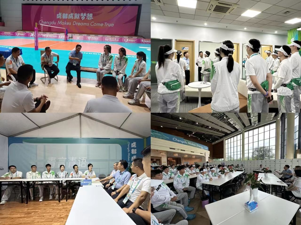 【本网讯】7月24日,学校党委副书记马洪江带队前往成都大运会双流赛区排球训练馆、网球馆、水球馆、射箭馆等场馆看望慰问乐动在岗志愿者。学校党委办公室、校长办公室、体育部、校团委等部门负责人陪同参与。