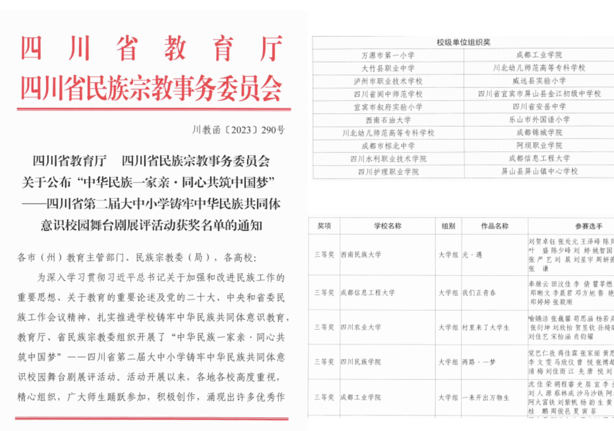 【本网讯】近日,四川省教育厅、四川省民族宗教事务委员会印发《关于公布“中华民族一家亲·同心共筑中国梦”四川省第二届大中小学铸牢中华民族共同体意识校园舞台剧展评活动获奖名单的通知》。乐动选送的舞台剧原创作品《我们正青春》在本次大赛大学组中荣获三等奖;学校获本次活动优秀组织奖。