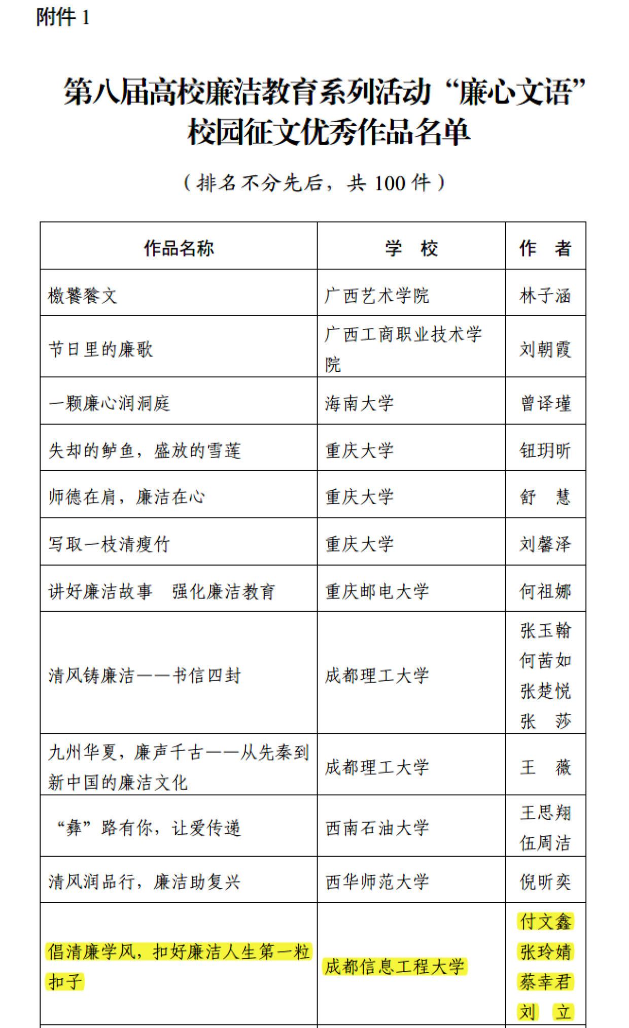 第八届高校廉洁教育系列活动是教育部为深入学习贯彻党的二十大精神,贯彻落实党中央《关于加强新时代廉洁文化建设的意见》,围绕落实立德树人根本任务,纵深推进高校全面从严治党举办的系列活动。本届高校廉洁教育系列活动经学校推荐、省区市推荐、专家遴选,评选出“廉心文语”校园优秀征文、“润心话语”视频优秀作品、“清心妙语”创意优秀作品、案例展示优秀作品各100件。
