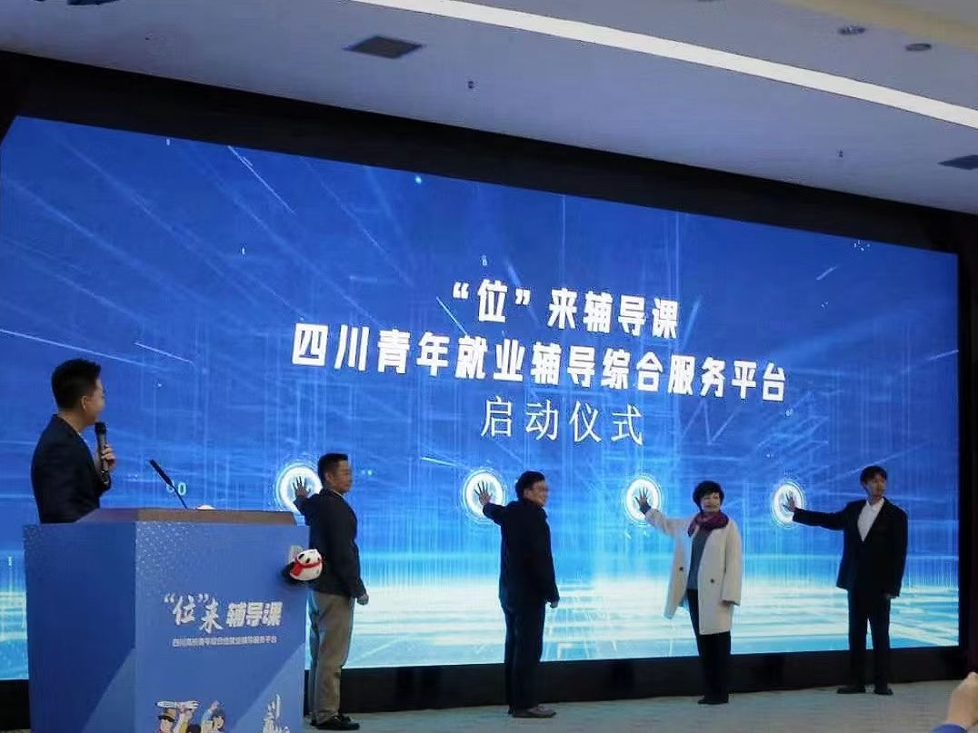 活动现场,熊义堋、钟岚、陈权亮以及乐动优秀学生代表马栩镯共同启动了“‘位’来辅导课” 四川青年就业辅导综合服务平台。