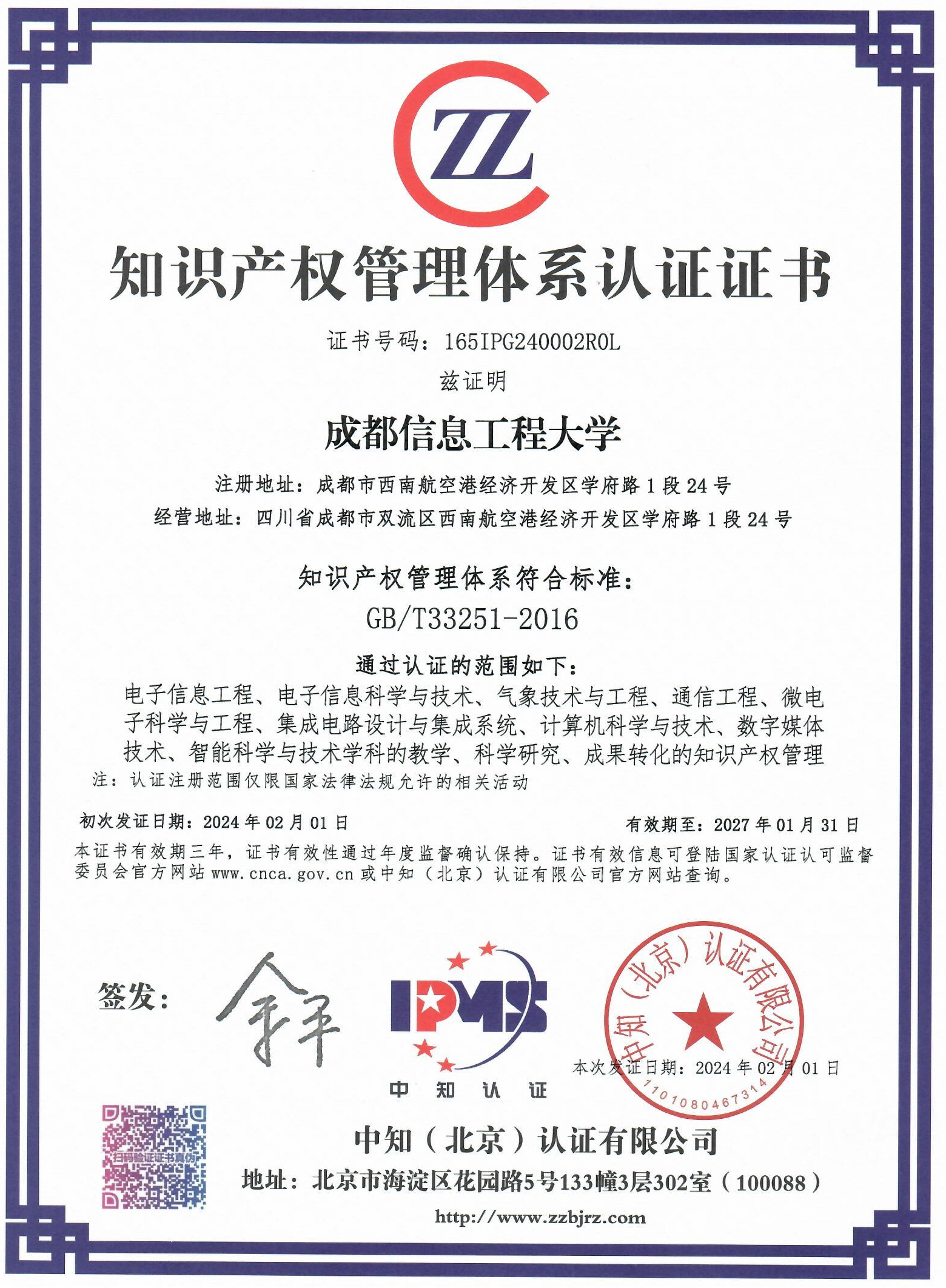 2024年1月19日,中知(北京)认证有限公司贯标认证专家组进校开展现场审核,对学校知识产权管理体系的架构搭建、知识产权运营、科技成果转化成绩等给予充分肯定,一致同意学校知识产权管理体系通过贯标认证。