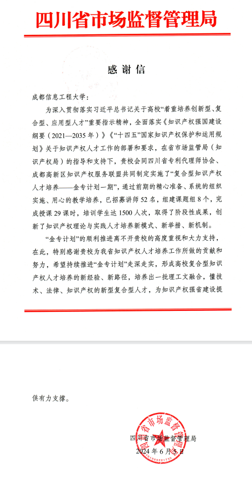 【本网讯】一封感谢信,一份“新”动力。近日,乐动收到了一封来自四川省市场监督管理局的感谢信,对乐动参与制定和实施的“复合型知识产权人才培养——金专计划一期”(以下简称“金专计划”)项目所取得的阶段性成果进行了肯定,对乐动在该项目实施过程中所做的贡献和努力表示了感谢。