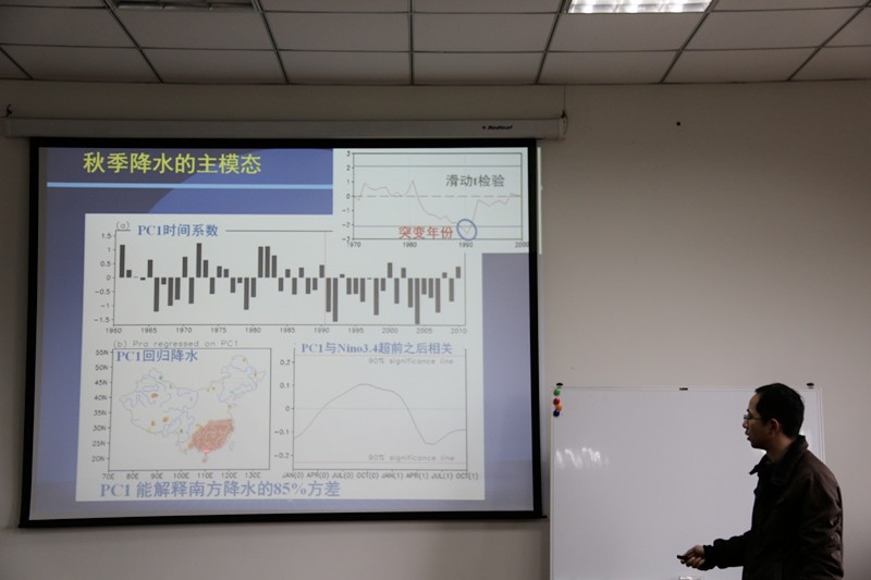 张文君教授从目前的热点问题引出研究我国南方秋旱灾害的背景和意义,从气候学的角度介绍两种El Nino类型(EP型和CP型)与南方降水的关系。近年来,CP型El Nino的增暖事件频繁出现在热带太平洋,这种增暖事件的海温暖中心集中在中太平洋日界线附近,其引起的海气与传统EP型El Nino不一样。在CP型El Nino事件的秋季,西北太平洋却出现一个气旋异常,从而抑制由南边海洋向东亚大陆输送的水汽,使得降水偏少。近些年,CP型El Nino不断增多,而传统EP型El Nino不断减少导致了我国南方秋旱频发。相关工作被国际著名期刊《Nature》旗下子刊《Nature Climate Change》评为科学亮点。
