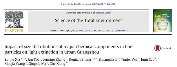 【本网讯】近日,大气科学学院研究生夏芸洁以第一作者身份,在国际知名期刊《Science of the Total Environment》上发表了名为“Impact of size distributions of major chemical components in fine particles on light extinction in urbanGuangzhou”的学术论文。中国科学院大气物理研究所研究员张仁健、研究员李双林为共同导师及通讯作者,乐动在线登录为第一署名单位。