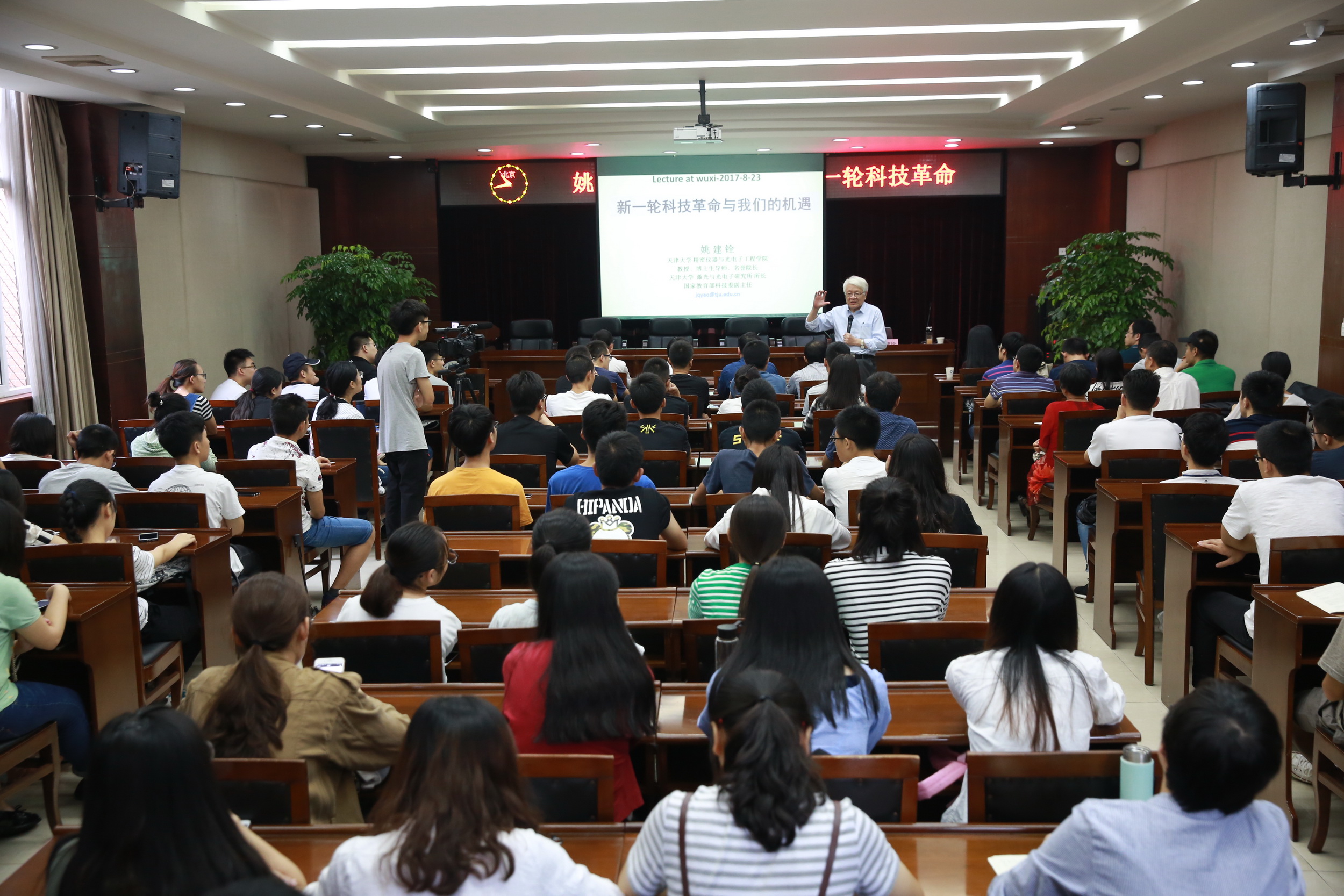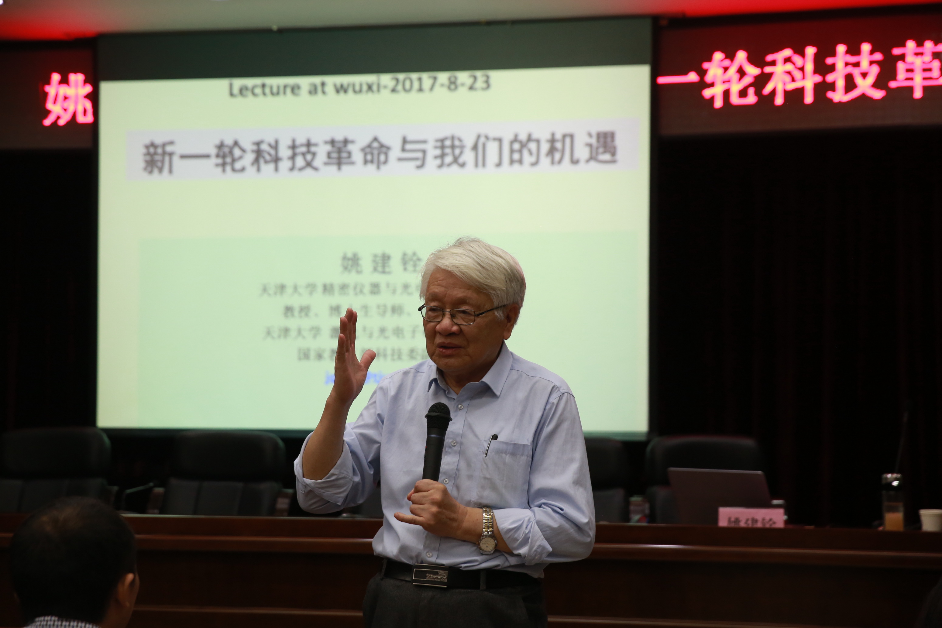 姚建铨院士从自身的五个科研方向“激光与非线性光学”、“太赫兹技术”、“微纳光电子器件”、“物联网及智慧城市”和“智慧海洋和智慧空天”出发,分析了2017年科学技术发展的新趋势,科技创新活动的新模式和全球创新格局调整的新问题;他简要介绍“激光致声通信实验”的研究进展,阐述了当前实验面临难题,诸如“波浪对通信的影响”、“海水盐度和浑浊度对信号传播的影响”等问题,引用雨果名言“与有待创造的东西相比,已经创造出来的东西是微不足道的”,强调科技创新的前沿永无止境,鼓励大家要准确把握世界科技发展新趋势,树立创新自信,抢抓战略机遇,为实现中华民族伟大复兴的中国梦提供强有力科技支撑。