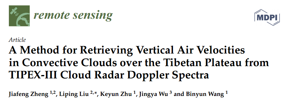【本网讯】在第三次青藏高原大气科学试验项目、国家自然科学基金、中国气象科学研究院灾害天气国家重点实验室基金的支持下,乐动大气科学学院郑佳锋博士近日以第一作者身份在国际知名期刊《Remote Sensing》-Atmospheric remote sensing (IF=3.244,JCR二区)上发表了题为《A Method for Retrieving Vertical Air Velocities in Convective Clouds over the Tibetan Plateau from TIPEX-III Cloud Radar Doppler Spectra》的学术论文。