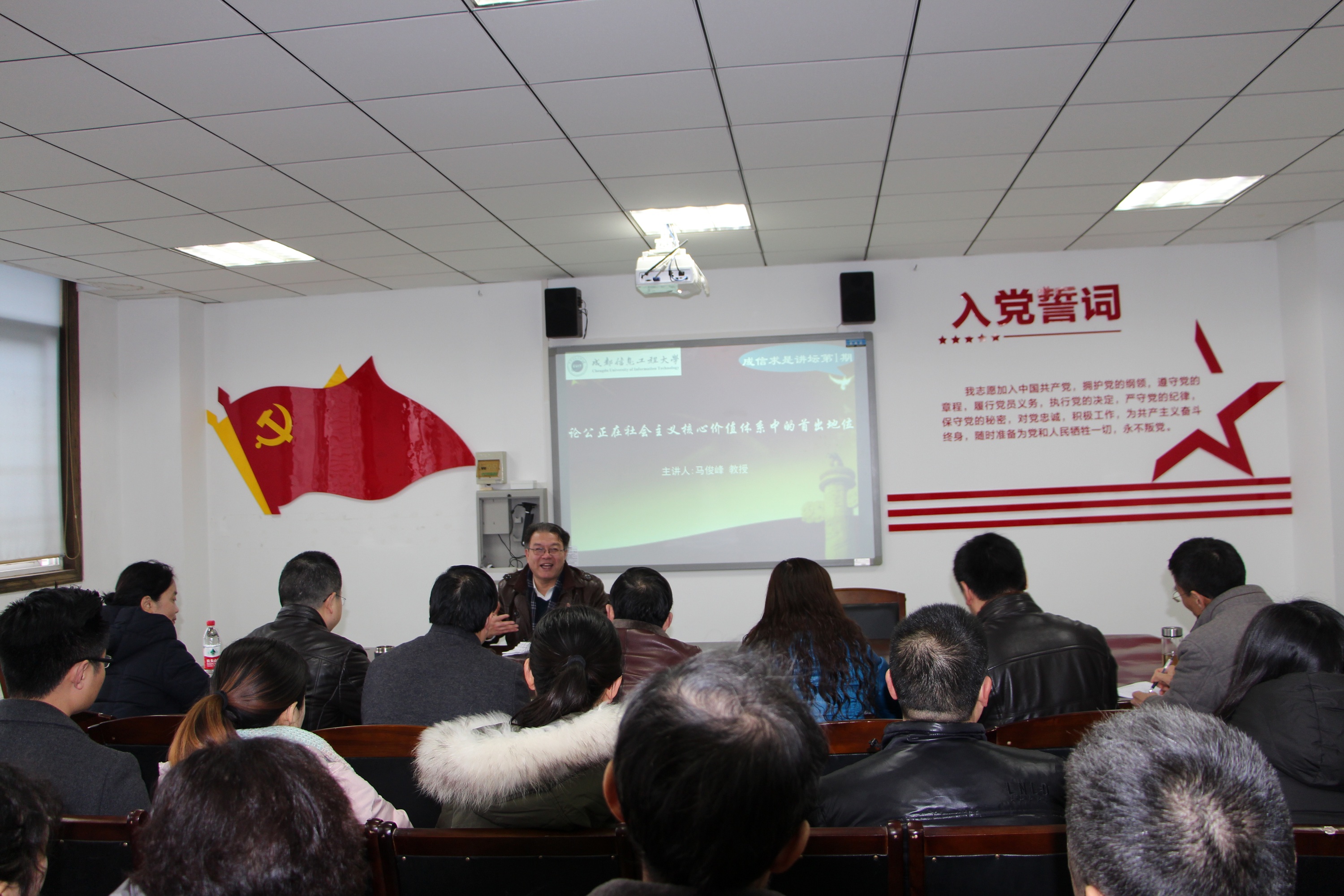 马俊峰以“论公正在社会主义核心价值体系中的首出地位”为主题进行了讲座,揭开了马克思主义学院首届“成信求是讲坛”的序幕。他以独特的视角、批判性的思维为全体老师呈现了一堂精彩的讲座,开阔了老师们的眼界和学术视野,对老师们的学术研究有着很好的指导意义。老师们与他进行了互动和深入地交流,并纷纷表示“成信求是讲坛”开办很有意义,有利于提升马克思主义学院的学术氛围。