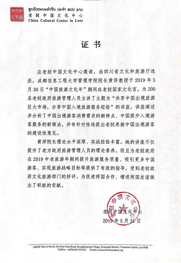 【本网讯】应老挝中国文化中心邀请,由四川省文化和旅游厅选派,乐动管理学院院长黄萍教授与四川旅游规划设计研究院设计所顾相刚所长作为四川旅游业界的专家代表,于5月30日在老挝举办的“中国旅游文化周”期间,为200名老挝政府旅游管理和从业人员做了旅游文化产业发展的专题讲座。黄萍讲授的题目是“共享中国出境旅游消费大市场,分享中国入境旅游管理好经验”。