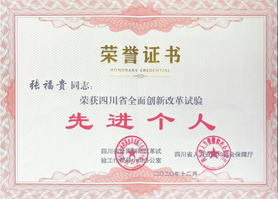 【本网讯】12月25日,为弘扬先进、树立典型,进一步营造全社会支持改革、鼓励创新的氛围,四川省全面创新改革试验工作领导小组办公室、四川省人力资源和社会保障厅印发《关于表彰四川省全面创新改革试验先进集体和先进个人的决定》(川全创办〔2020〕2号),对全省77个先进集体和150名先进个人予以表彰。乐动电子工程学院(大气探测学院)副院长张福贵教授被授予“四川省全面创新改革试验先进个人”荣誉称号。