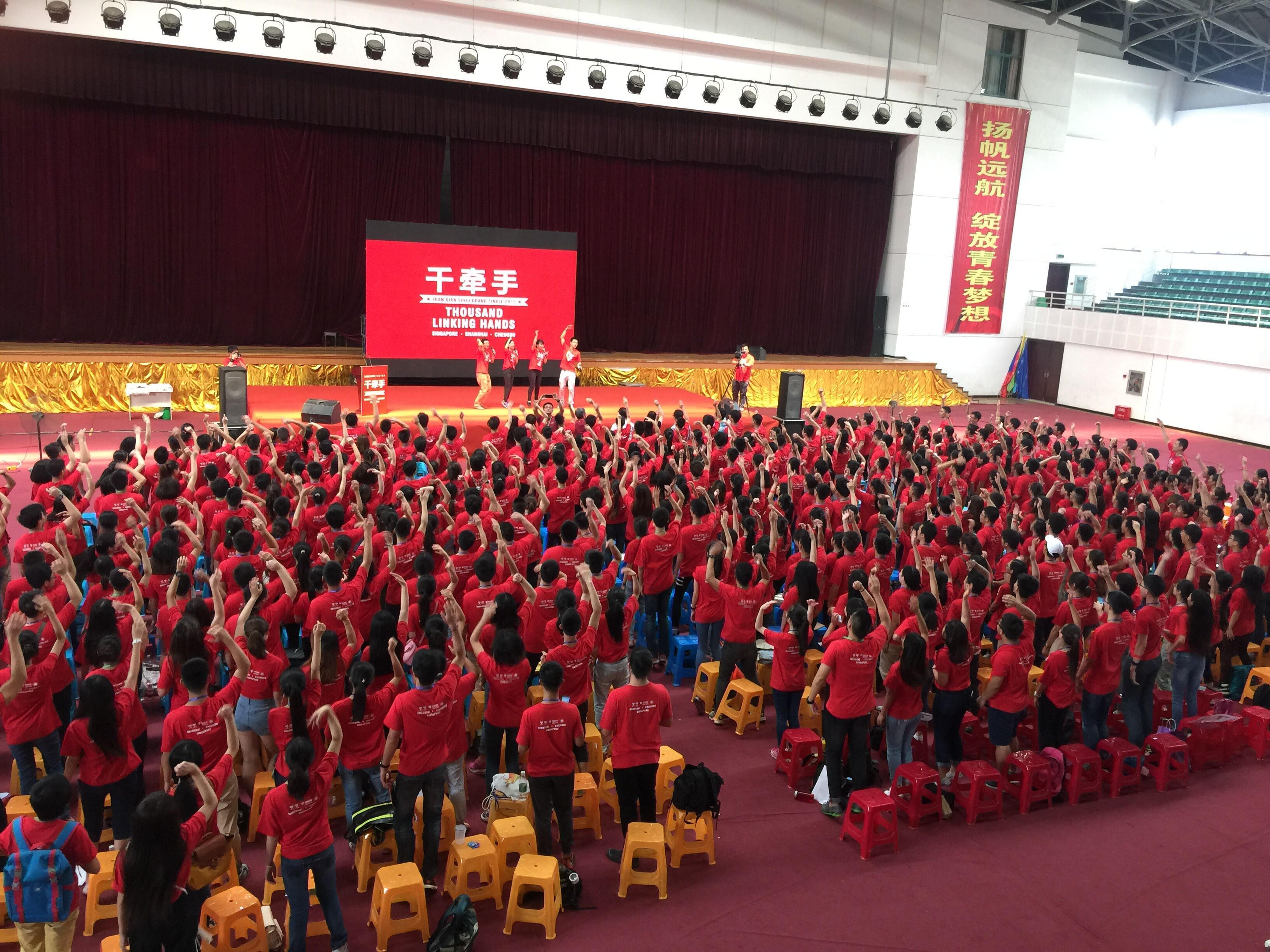 7月19日上午,由乐动在线登录与触爱社会服务(新加坡)共同主办的2015“千牵手”夏令营公益活动开幕式在乐动航空港校区体育馆举行。乐动副校长于世祥、触爱社会服务(新加坡)执行董事萧树庆,以及触爱有关负责人、学校团委、文化艺术学院主要负责人与中新双方500余名师生志愿者参加了开幕式。