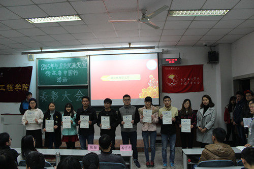 19:00,主持人李婷宣布表彰大会正式开始,由姜宇忠老师致开场辞并且总结2015年气象防灾减灾宣传志愿者中国行活动的成果。随后播放了2015活动视频集锦,让我们更加切身体会到了活动的具体进程。之后进入颁奖环节,依次为优秀队伍,优秀队长,优秀队员颁奖并且颁发了优秀征文奖。最后由电子工程学院学生会副主席兼青志协会长刘婧雯致总结辞。