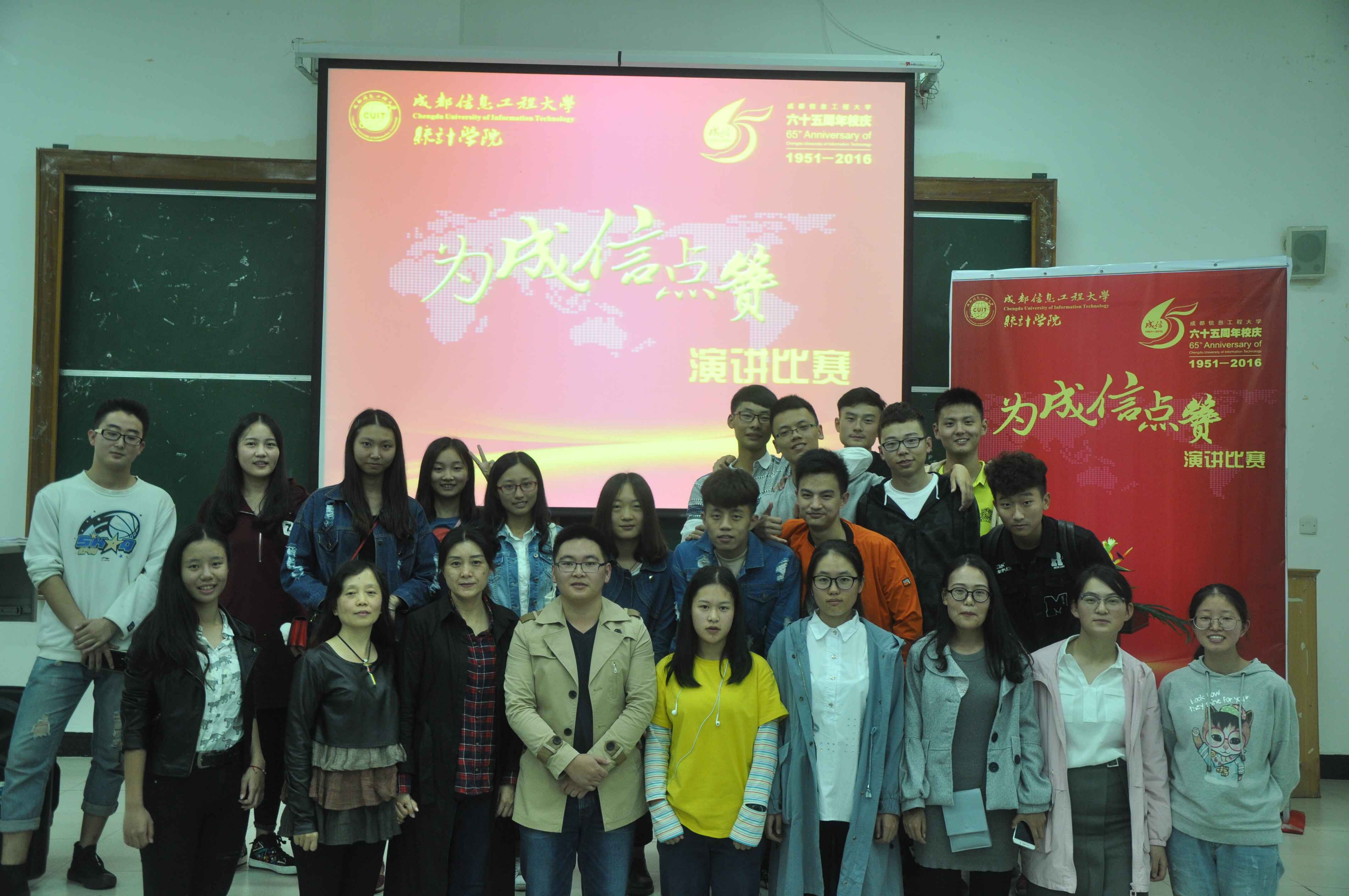 【本网讯】六十五载,风云变化,乐动在线登录迎来了65周年庆。10月9日晚,统计学院在龙泉校区4101教室举办了庆祝学校成立65周年“为成信点赞”演讲比赛。本次比赛共有通过各班及学生会各部门推荐的14名选手参加。统计学院邹永红副教授,邹红梅老师,学院团委书记彭波老师担任本次比赛评委。来自2016级的120名大一新生及学院全体学生组织成员观看了此次演讲比赛。