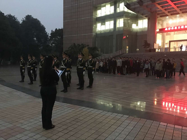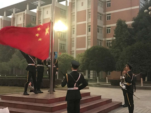 12月9日上午7:30,国旗护卫队迎着东升旭日,踏着整齐有力的步伐庄严前进。在激昂的《义勇军进行曲》中,五星红旗冉冉升起。接着,学生干部代表进行了国旗下演讲。她回顾历史,号召大家勿忘国耻,勿忘初心,鼓励大家要志存高远,继续前行,并表达了对未来的美好憧憬和期盼。