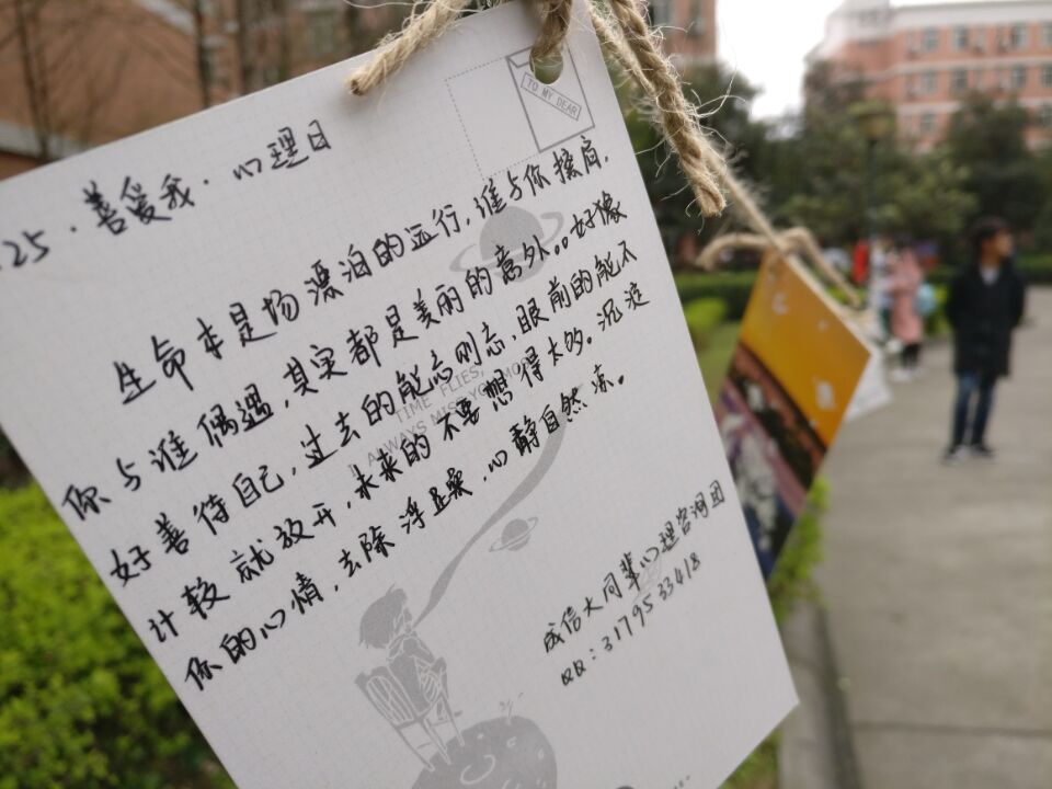 现场活动策划了暖心明信片、爱心许愿瓶、我的情绪我做主、“心有晴天,笑对生活”最美微笑评选四大主要活动。以暖心明信片、爱心许愿瓶的形式,让同学写下对未来的期望,与他人交换心愿,促进沟通交流。我的情绪我做主活动里,参与者抽取并大声朗读积极向上的文章段落,同时填充“我害怕()但是我知道()”的空格,帮助同学们寻找生活中的积极资源。在“心有晴天,笑对生活”最美微笑评选中,同学们用相机记录下周围同学微笑的美丽瞬间,最终经过投票评选出了“最纯真的微笑”、“最个性的微笑”、“最幸福的微笑”等奖项并且将照片贴在展板上展览。