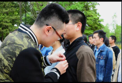 学生党支部副书记为新发展的党员佩戴党员徽章