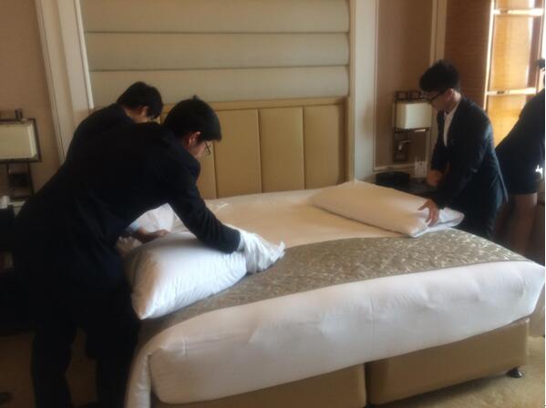 在工作人员的带领下,同学们分三组参观了客房、FLAIR酒吧、中餐厅和香荟自助餐厅,并亲自参与尝试了做床和制作草莓奶油蛋糕。