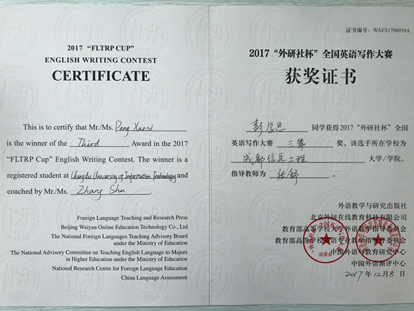 【本网讯】2017“外研社杯”全国英语写作大赛全国总决赛于12月8日在北京外研社国际会议中心落下帷幕。乐动网络工程153班的彭学思同学经过校级初赛、省级决赛的层层选拔,以四川赛区第一名的成绩闯入全国总决赛,与从全国五万余名参赛者中脱颖而出的90名选手展开激烈角逐,并最终荣获全国三等奖。这是迄今为止乐动学子在该项赛事中所取得的最好成绩。外国语学院张舒老师同时荣获2017“外研社杯”全国英语写作大赛指导教师三等奖。