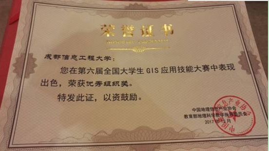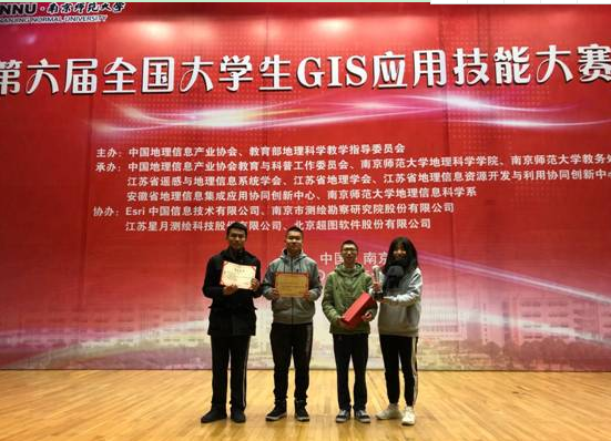 【本网讯】 12月10日,第六届全国大学生GIS应用技能大赛在南京师范大学圆满地落下帷幕。乐动由褚永彬、薛亚婷两位老师带队,张光耀、蓝绍萌、周振雄、高姗四名同学组成的团队经过几个月的努力准备,赛场上发挥稳定,荣获二等奖。乐动荣获优秀组织奖。