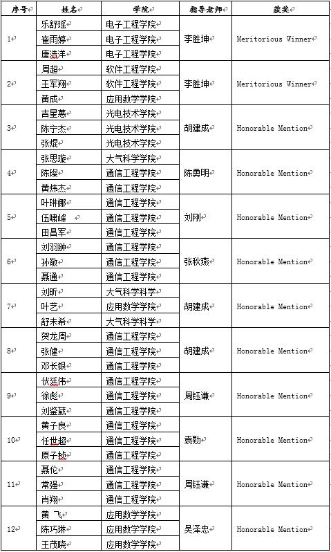 【本网讯】由美国数学及其应用联合会主办的美国大学生数学建模竞赛顺利结束。在学校领导的关怀和教务处的大力支持下,在参赛同学们的辛苦努力下,乐动参赛队伍再次取得优异成绩,获得2项Meritorious Winner(国际一等奖)和10项Honorable Mention(国际二等奖)。