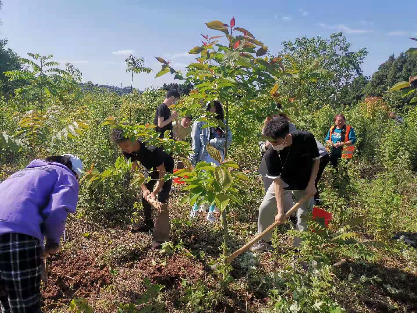 植树现场,大家干劲十足,热情高涨。经过简单的现场培训、合理分组后,大家有序领取铁锹、锄头、肥料、水桶等工具,在除草、松土、施肥、提水、浇水环节中紧密配合,掘坑培土,植苗灌溉,迎难而上。经过几个小时的紧张劳动,高效完成了此次管护任务。