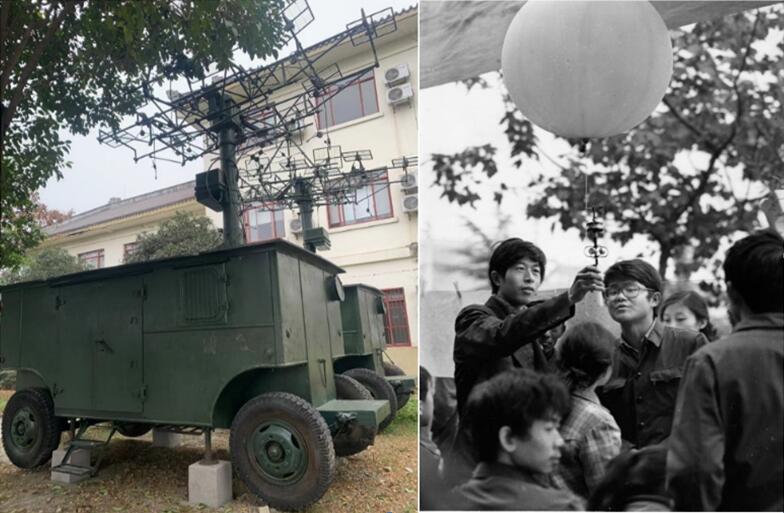 图2学院大气探测博物馆门前陈列701雷达(左),1952年师生测风讲授留影(右)