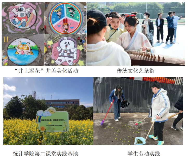 校园文化活动作为第二课堂的主要活动形式和内容,不仅浓郁了校园文化氛围,而且彰显了统计学院学生的青春活力,同时为获得第二课堂积分增加了多样性。第一、服务学生成长需求,助力学生全程发展。统计学院依托“梦起航”职业生涯工作室开展以提升就业技能为核心的第二课堂活动“就业小讲堂”、“致敬了不起的她”等活动,着力引导学生挖掘自身力量,放眼广阔职业领域,引领学生树立良好就业观和择业观,服务全校师生超500人,收到高质量正能量反馈30余篇。第二、加强美育建设,助推文化自信。打造美丽校园、培养学生的审美观,发展学生鉴赏美、创造美的能力。开展“井上添花”井盖美化、传统文化艺条街等活动,活动坚持“创造性转化、创新性发展”的原则,坚定不移推进文化自信自强,以提升学生综合素养和身体素质为共识,活动多用成信元素、统计学院特色,以此达到树德、强体、育美的目标。第三、着力推进劳动实践育人。学院秉持以劳树德、以劳创新、以劳育美的原则,引导我院学生在劳动中学会做人做事,促进学生在劳动中树立正确的劳动观和劳动态度。从而达到全体同学尊重劳动、热爱劳动的意识,养成良好的生活习惯,培养学生吃苦耐劳、团队协作的精神,提高意志,磨炼品格。在学院领导班子的支持下,积极配合学校和后勤部门完成了多次劳动实践,我院900余人次参与到劳动育人项目中。第四、加强大学生体育教育。体育教育是实施“五育”并举的重要内容,我院积极引导学生通过体育锻炼强健体魄,实现健身健心的重要目标,近年来,我院学生体测通过率近99%,除了体育课外,学院积极开展多种体育活动,如新生杯篮球比赛、足球比赛、师生趣味运动会等。