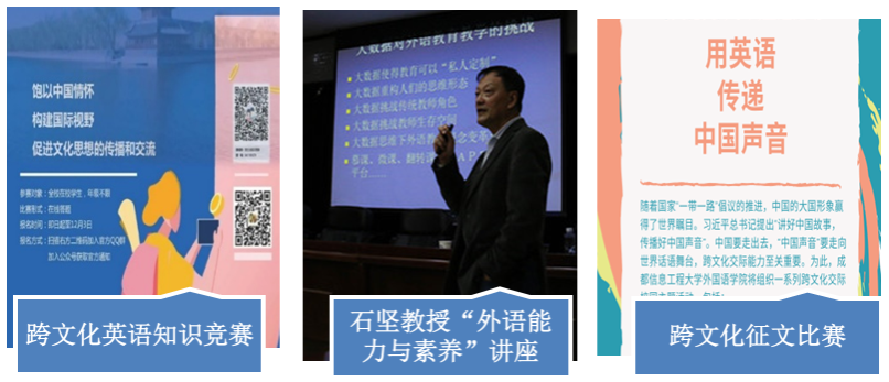 除了第一课堂教育,外国语学院还将对学生的跨文化交际能力、国际视野和家国情怀的培养延伸至第二课堂:组织了形式多样、丰富多彩的跨文化校园活动,指导学生开展创新创业、发表学术论文,创建“成信大跨文化交际”微信公众号。