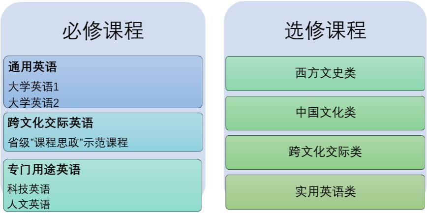 在理论指导及对兄弟高校的充分调研下,结合本校自2015年开始本一批次招生、生源质量明显提高的实际,外国语学院于2016年修改人才培养方案,构建了以通用英语、跨文化交际英语和专门用途英语(理工院系为科技英语、文管院系为人文英语)三大类课程为主体,以英语演讲、媒体英语视听说等为辅助,以跨文化交际能力培养为核心的大学英语课程体系。